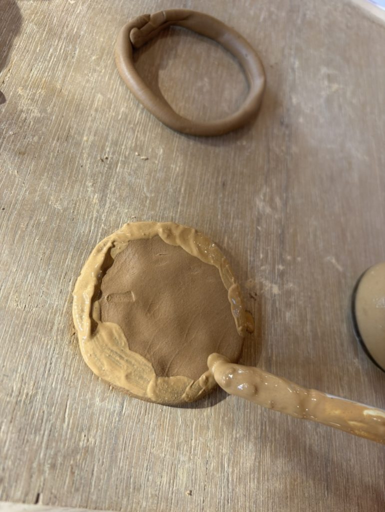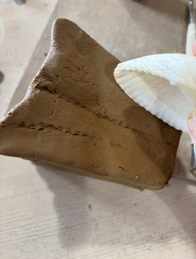 貝殻で模様をつけます。実際の上野原縄文の森の土器も貝殻で模様をつけていたそうですよ。