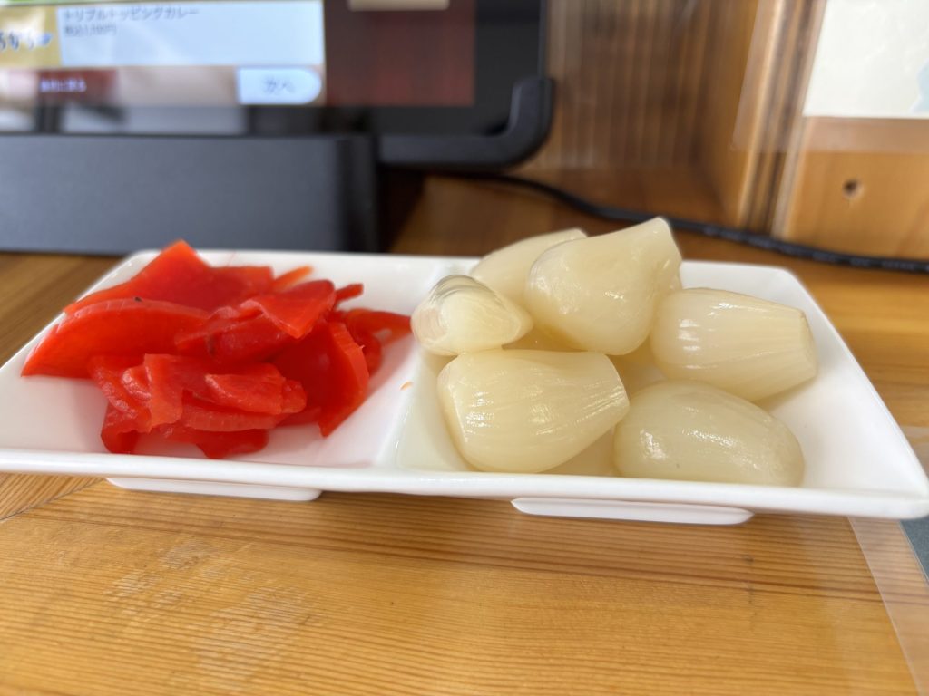 そんな戦いの箸休めならぬスプーン休めにありがたいらっきょうと福神漬け。