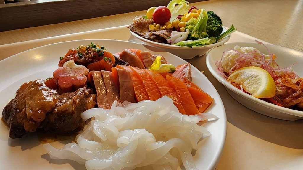 特に夕食は種類も豊富で、いつも楽しみにしているのがお刺身!脂ののったサーモンやカツオのたたき、イカなど、お刺身が食べ放題っていうのが本当に嬉しい。笑