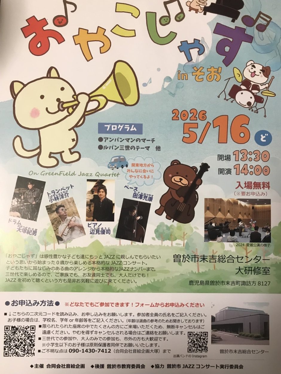 - 親子で楽しめるジャズコンサート。なかなか、小さい頃からジャズに触れる機会は無いので、ぜひ、この機会に親子や三世代でジャズを楽しめたら、素敵だなぁと。しかも、関東地方から、鹿児島に来てくださるとは、何とも嬉しいことです。この機会をお見逃しなくですね!そしてプログラムも、アンパンマンのマーチからルパン三世のテーマまでと、三世代で楽しめそうな予感。チラシをよ〜く見ると、実は大人だけでも参加出来るとのこと。JAZZを初めて聴くという方もOK とのこと。どなたでも申し込み出来るということで、ぜひ、チラシのQRコードから、お申し込みされてみてはいかがでしょうか?もし、お申し込みされてからキャンセルされる方は、ご連絡してくださいとのこと。※小学生以下のお子様は、原則保護者同伴で、お願いしますとのこと。★日時:2026年5月16日土曜日 開場13:30 開演14:00★場所:曽於市末吉総合センター 鹿児島県曽於市末吉町諏訪方8127★入場料:無料(※要お申込み)★主催:合同会社音絵企画★後援:曽於市教育委員会★協力:曽於市JAZZコンサート実行委員会★お問い合わせ先:090-1430-7412