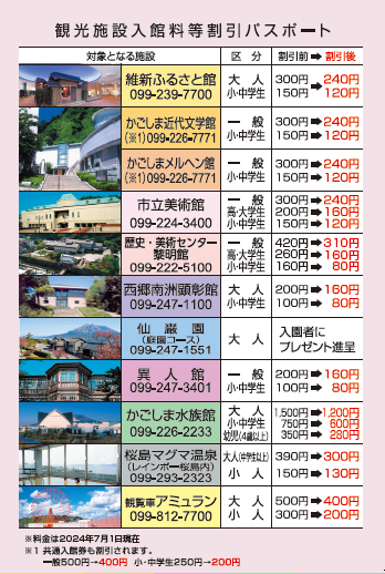 維新ふるさと館や仙巌園、かごしま水族館など10箇所以上の主要観光スポットの割引パスポートが付いているため、鹿児島市内の観光がさらにお得になります!!